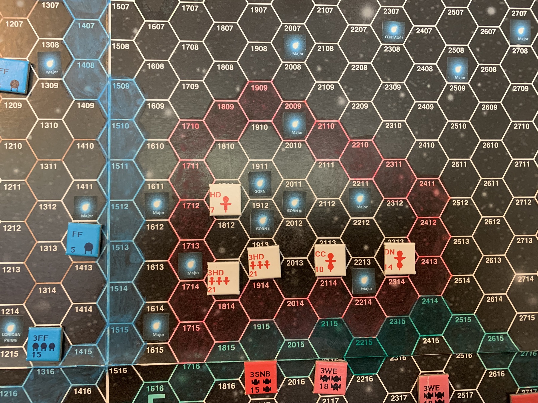 I still have to make some counters for the Cardassian's, Ferengi and the Breen. But you can see Bajor and the Wormhole in hex's 3104 and 3204 above. Each hex is regarded as a Sector on the map. The Badlands can also be seen in sectors 3103, 3202 & 3203. The Ferengi Alliance is visible in purple around sector 3201.